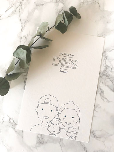 Bij ons heeft ze zelf in aquarel getekend net zo lang tot iedere druppel een mooie kleur had. Hierna werd het kaartje door haar ingescand en mocht ik zelf het juiste lettertype kiezen.